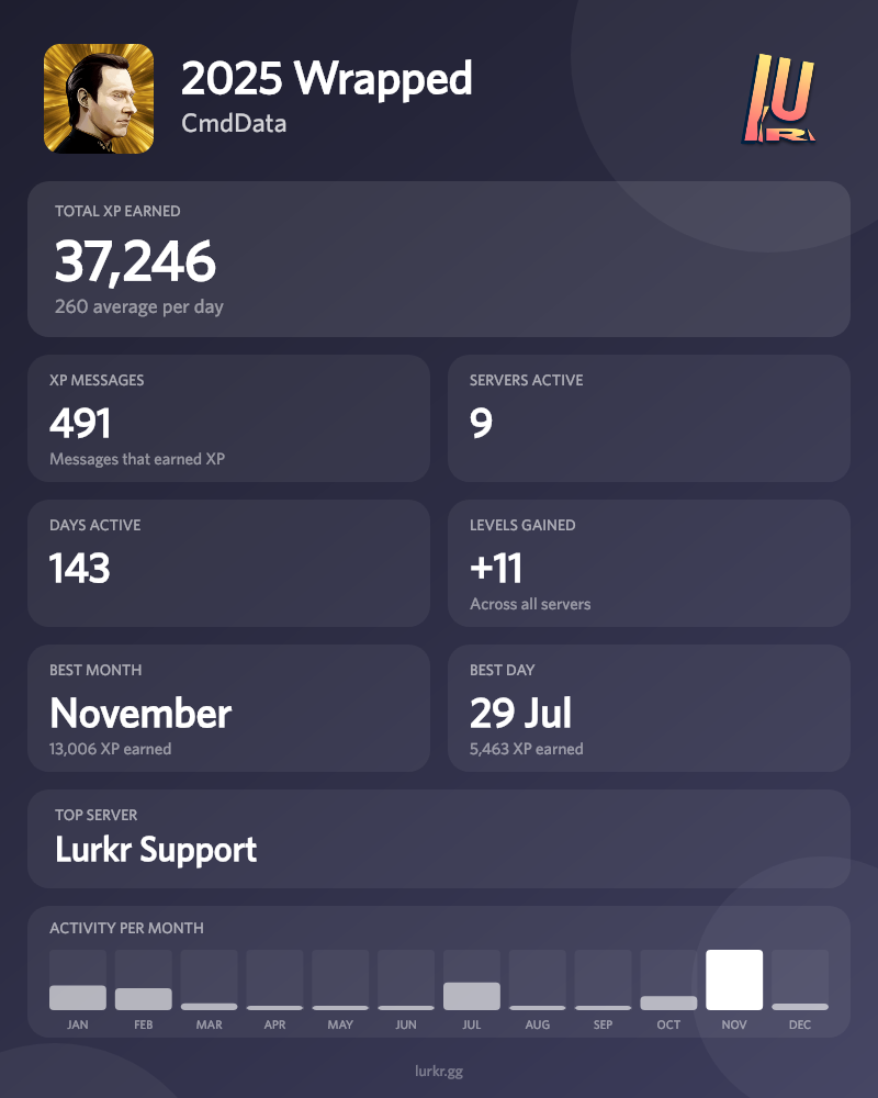 /wrappedto show your Lurkr year in review!- Shows your Lurkr statistics across all of your Lurkr enabled servers!