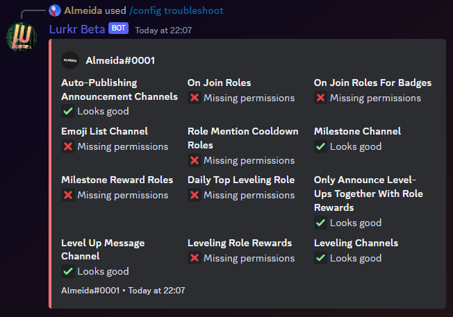 This method of the config command can be used to check if features of Lurkr have been correctly configured either using the dashboard or some of the other methods of the config command.