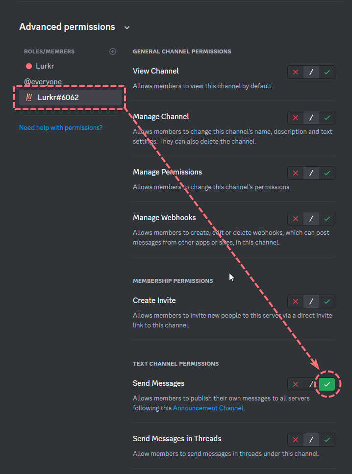 This next step is quite crucial. By default, Lurkr won't be able to announce any messages in the new channel, and therefore you need to grant either Lurkr (The Bot Account) or Lurkr (The Integration Role) the Send Messages and Manage Messages permissions in the newly created announcement channel.