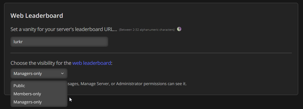 | Managers-only | Only people with Manage Messages, Manage Server, or Administrator permissions can see it. This means your leaderboard will not be indexed on the web. |