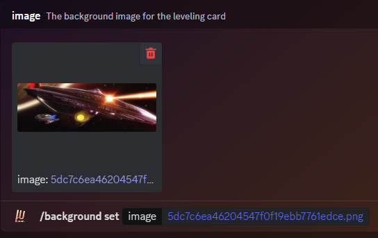 Your custom background needs to have a wide aspect ratio to fit into the leveling card. The recommended aspect ratio is 4:1 (e.g. 1600x400), but any image with at least a 2.5:1 ratio is accepted. The bot will tell you if the image you have provided is inadequate. If your image only strays slightly from the required aspect ratio, the bot will try to compensate and cut off any excess to make the image fit.
