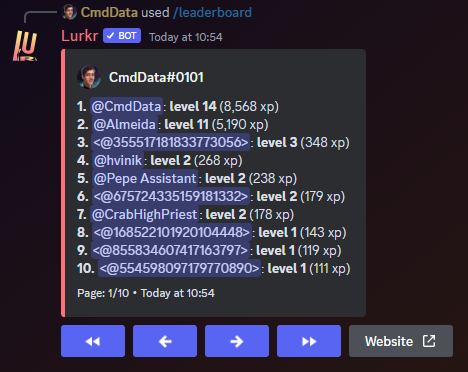 The embedded message will add â and âļ buttons, which when pressed by the command author allows you to turn to the next leaderboard page. A total of 10 users can be listed on the same page, and are shown what level they are and how much levels they have gained.