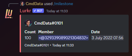 When you enter a milestone that you have previously achieved the bot will respond with the exact member count that was achieved, the member who is considered as the 'milestone member', and the exact time and date when said milestone was achieved.